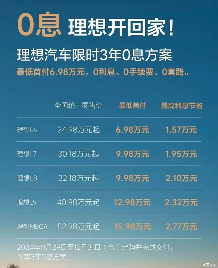 就在昨天11月29日,理想汽车发布新的销售政策,在12月31日前,限时推出了最低首付金额3年0息的方案,理想L6最低首付7.98万。在这个接近年关,很多人想要买车过年,车企也在冲刺全年销量,力争在四季度获得比较好的销售数据的时候,理想出台这个政策争抢客户并不意外。如果看好理想汽车的消费者,趁着这一波优惠政策,还是很划算的,以理想L6为例,可以节省利息1.57万。
