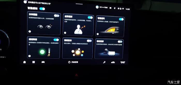 点击大屏幕进入菜单键,找到智能感知开始设置。分神设置,会通过方向盘上的摄像头感应驾驶人员的眼神方向,当没有没有注视前方时,车机会报出“主人,请集中注意力哦”的提示,避免一时分神引发事故;疲劳缓解,这个功能我还没有触发过,试过打哈欠什么的,可能系统识别到我是假疲劳了吧,哈哈;智能通风,这个很赞,当前排人员吸烟时,会自动打开一侧车窗,并开启空调外循环,之后自动关闭,第一次坐我车的人都很震惊;通话降音,无论是手持电话还是蓝牙通话,都会关闭一侧车窗,并降低音乐音量,非常方便;情绪音乐,视线亮屏,这两个功能感觉比较鸡肋,直接就关了。