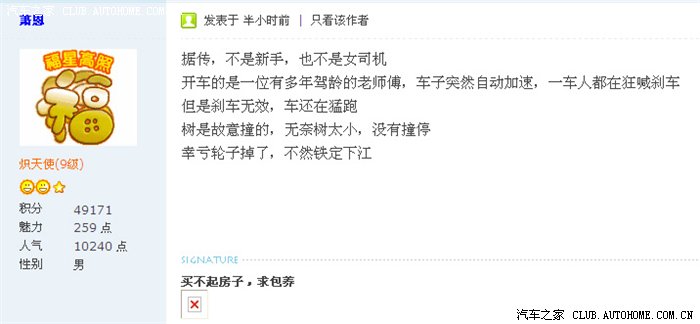 | 消息 (三峡晚报) (记者杨柳 报料人:李先生 奖金:20元)昨日早上,一辆丰田轿车在沿江大道江山多娇附近转弯时,突然失控冲向江边,幸亏左前轮脱落,轿车在离江滩护坡仅两米多远的地方停下来,车上4人侥幸逃过一劫。 昨日上午7时40分许,记者赶到现场看到,出事的黑色丰田轿车停在一株木芙蓉上,左前轮脱落,右侧车身变形,车头离江滩护坡仅有两米多远。 “当时我正在转弯,只有四五十码的车速,突然感到车子有自动提速的感觉,接着一下子冲过来了。”车主余先生说,瞬间轿车就撞到了隔离带的护阶,接着撞上一旁的电线杆,冲上草坪,并离江边越来越近。“快刹车!快!”这时,坐在车上的另外3人大声叫喊。“情急之中,我猛打方向盘,并连踩刹车,幸好经多次碰撞后,左前轮脱落,轿车才在江滩护坡前停下来。”余先生说,自己当时吓出一身冷汗,“要是车冲到江里,我们肯定完了”。 据余先生介绍,这辆车是丰田凯美瑞2010款2.0豪华版车,前天刚买,“此前听说过丰田公司曾召回过此类车型,但我认为这款车经济实用,而且降价较多,比较省油,就买下了”。 事发后,交警赶到现场。目前,事故原因正在进一步调查中。 国家质检总局于2010年2月22日发布 《关于丰田汽车公司部分车型加速踏板和制动系统缺陷的风险警示通告》,提醒使用来自美国或日本的相关型号丰田车辆的消费者,立即联系最近的丰田授权服务中心,以确认是否在召回范围之内。如果在使用过程中发现车辆存在相关问题,消费者可按照车辆产地分别向国家质检总局缺陷产品管理中心(国产车)和所在地出入境检验检疫机构 (进口车)报告。 通告中称:由于车辆加速踏板和制动系统存在缺陷,丰田汽车公司近期在全球范围内大规模召回存在相关缺陷的车辆。涉及的车型中就有凯美瑞/佳美(Camry)。 国家质检总局网站的召回公告栏发布有31条关于丰田召回的信息,其中涉及凯美瑞轿车的有四条。 2009年8月18日,广汽丰田汽车有限公司、天津一汽丰田汽车有限公司按照 《缺陷汽车产品召回管理规定》的要求,向国家质量监督检验检疫总局递交了召回报告,决定自2009年8月25日开始,召回部分凯美 瑞 (CAMRY)、 雅 力 士(YARIS)、威驰(VIOS)及卡罗拉(COROLLA)轿车。本次召回涉及车辆总计688314辆,其中广汽丰田汽车有限公司2006年5月15日至2008年12月31日生产的凯美瑞轿车384736辆。