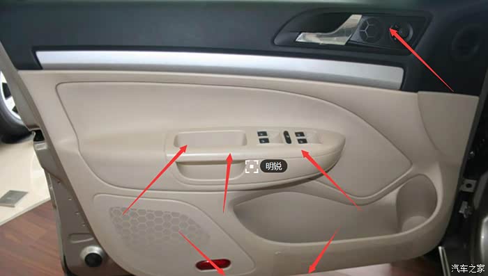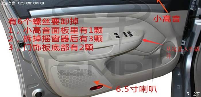 第一步,拆车门吧。这个已经拆过N次,先用塑料手板从车门按键面板前端箭头处手,用力撬(恢复时要先把面板后面装好,再装前面,不要搞错)。然后再撬高音面板。