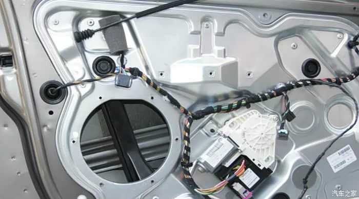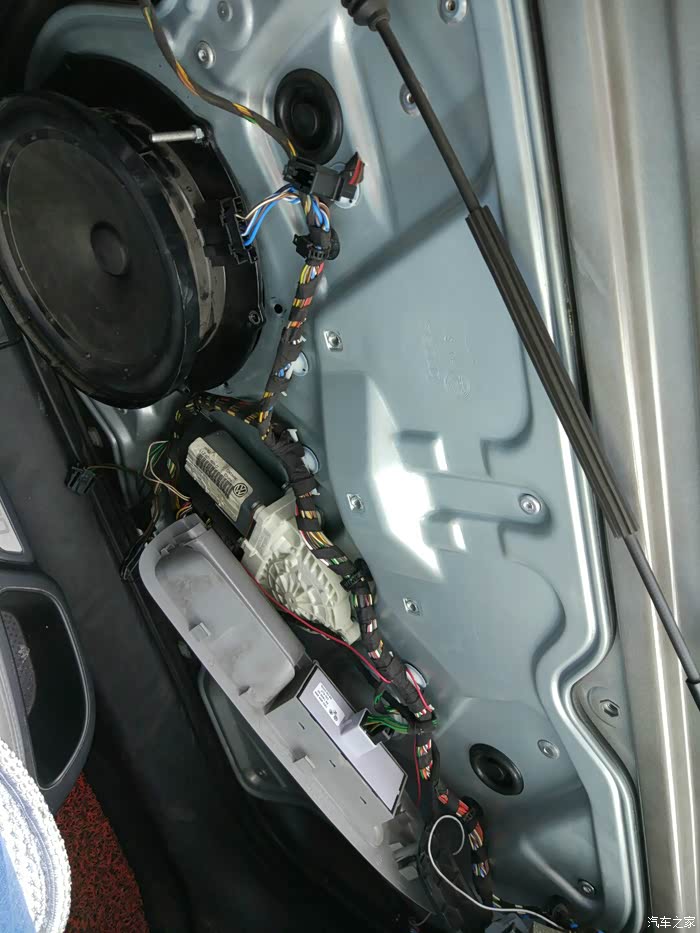 露出车门内部钢板(这用料做工,再比比某系美其名曰防尘布的塑料膜),用10号钻头打掉固定低音喇叭的6个铆钉,露出操作空间。