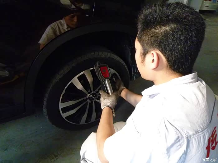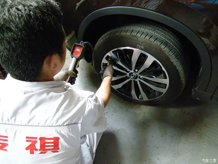 检测胎压,四条轮胎的胎压都有点高,需要放放气。