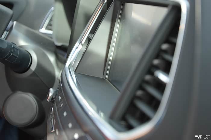 与中控台贯通一体的钢琴漆饰板经过一个漂亮的弧度巧妙地与三角形的铝拉丝饰板连接在了一起。