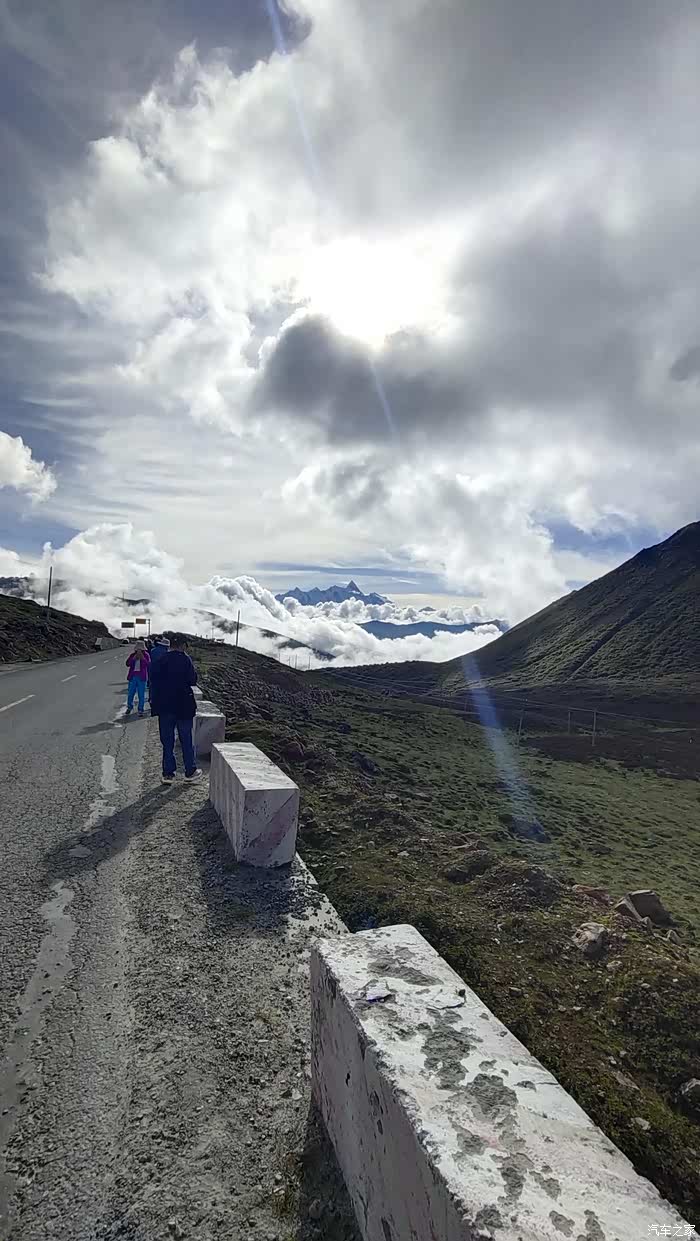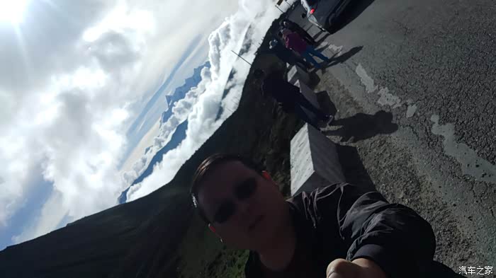 在到达山顶的时候,在路的旁边有一处被平整好的停车区。这里可以把车开下来在这里。拍几张照片,再看看远处的云。看看远处的雪山。风景非常的漂亮。而且今天的天气也非常给力。晴空万里。