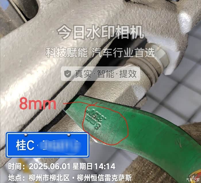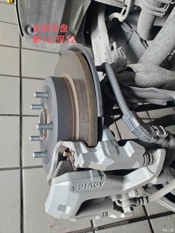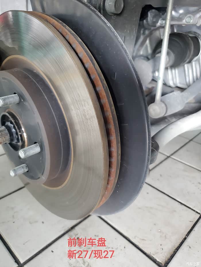按计划这次保养比以往加了拆4轮检测刹车盘、刹车片和换刹车油内容,其维修代码0B01004,工时费1020元。我与维修人员交流,他说我的车两前刹车盘出厂时厚度为27mm(这次实测为27mm),两后刹车盘出厂时厚度为12mm(这次实测为12mm);前两刹车片出厂时有关厚度为11mm(这次实测为10mm),后两刹车片出厂时有关厚度为9mm(这次实测为8mm)。两年来4个刹车盘基本没磨损,但4块刹车片平均被磨损1mm,一切还OK.