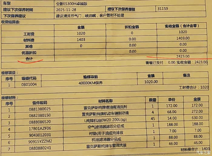 本次帐单显示总费用2423元,但并没有收我钱,即免费,依旧是lexus的风格!
