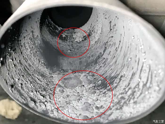 发动机安装完工后点火试车,红圈内的颗粒物是以后烧机油喷出堆积的机油积碳颗粒。