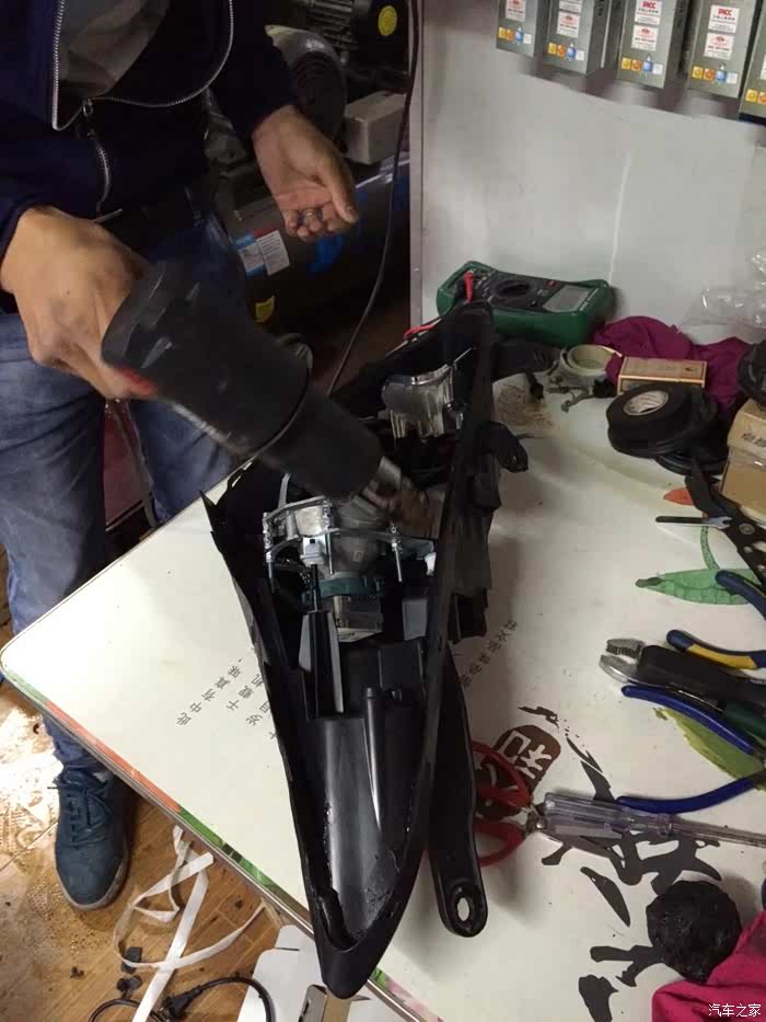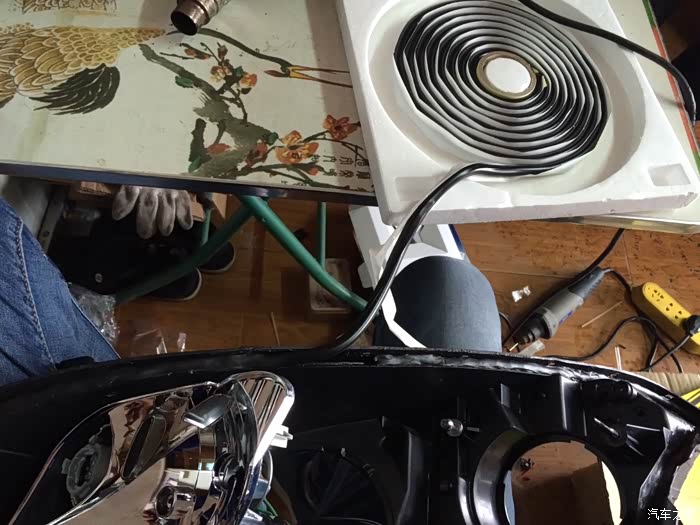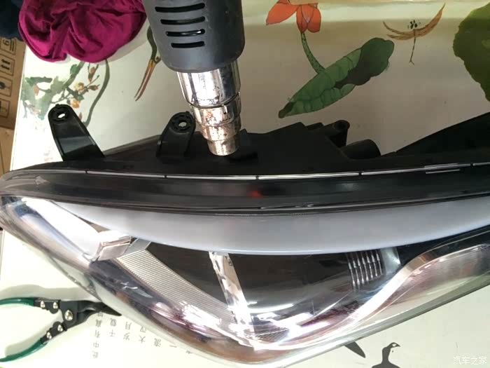开始开灯,,因为韩系车大灯用的是热融胶所以开灯没有任何必要使用烤箱,一把热风枪足够,杀鸡完全用不着牛刀。对着大灯一周,均匀加热十多分钟