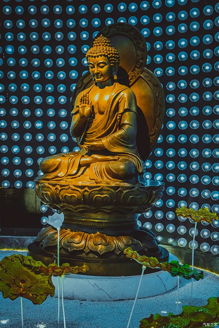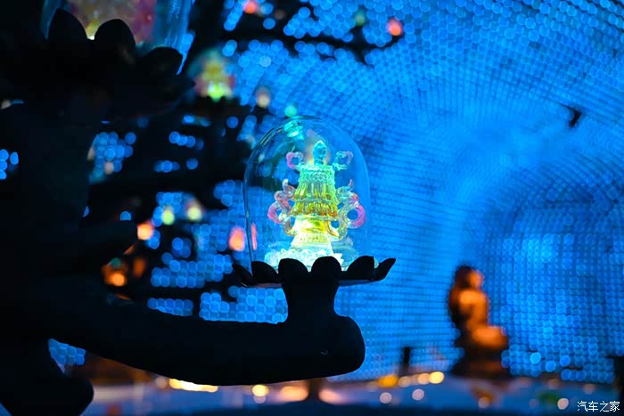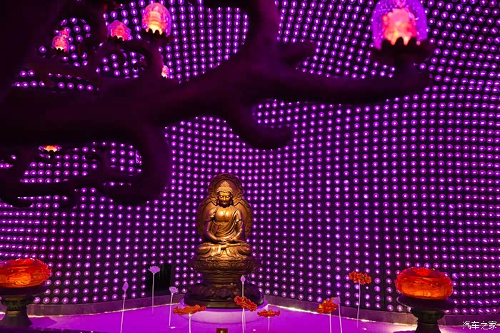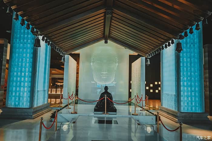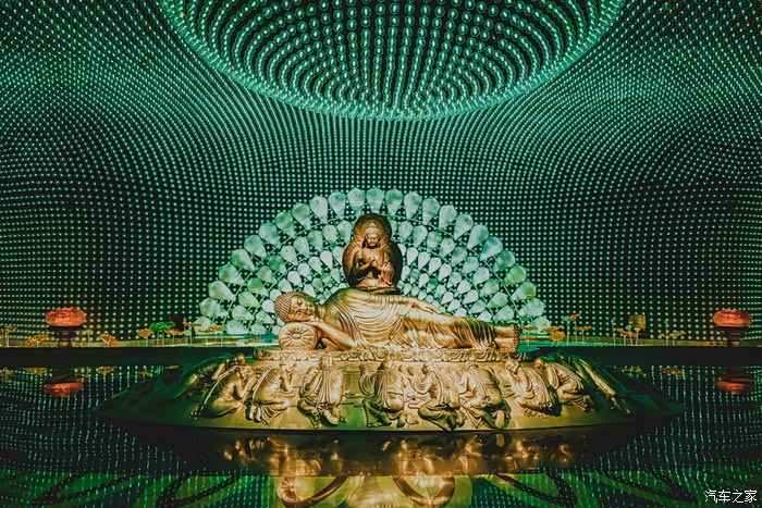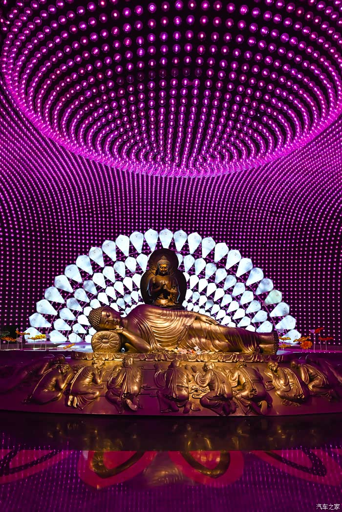最令人惊叹的是舍利佛光展区,这里镶嵌了八万四千盏灯,对应了佛教中“八万四千法门”,穹顶下是一尊涅槃造型的释迦牟尼佛像。灯光变换闪耀,不仅仅是视觉震撼,更是佛语禅意。