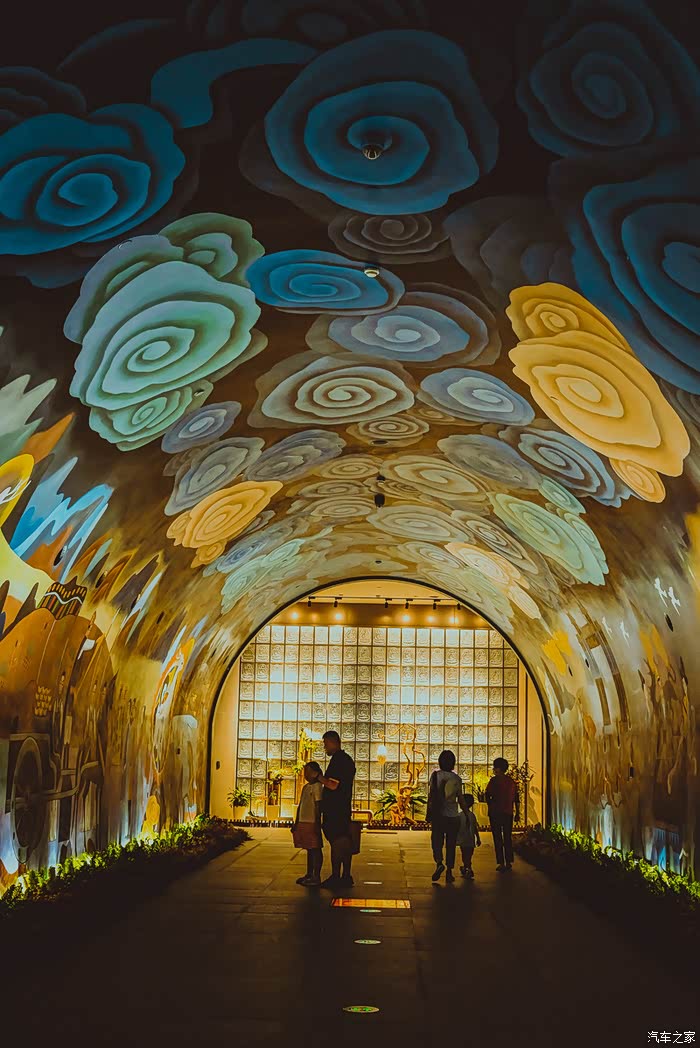 走出舍利佛光后,便是“经变画廊”,一条五彩缤纷的隧道,运用中国古代佛教绘画风格讲述了九色鹿的故事。