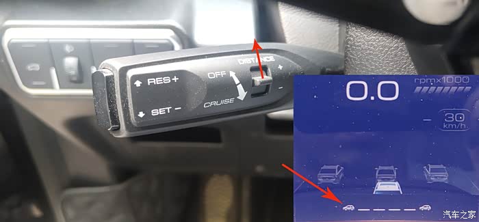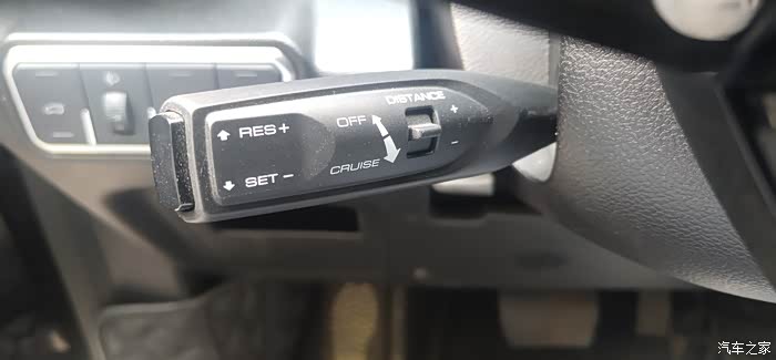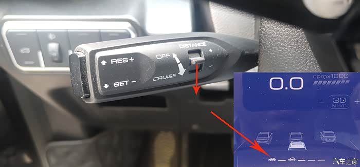 细心的小伙伴应该发现了巡航控制杆上还有个小拨片,它是用来调整巡航跟车距离的,一节是一个车身位,大家自由选择吧,但是安全起见,还是要和前车之间保持适当距离