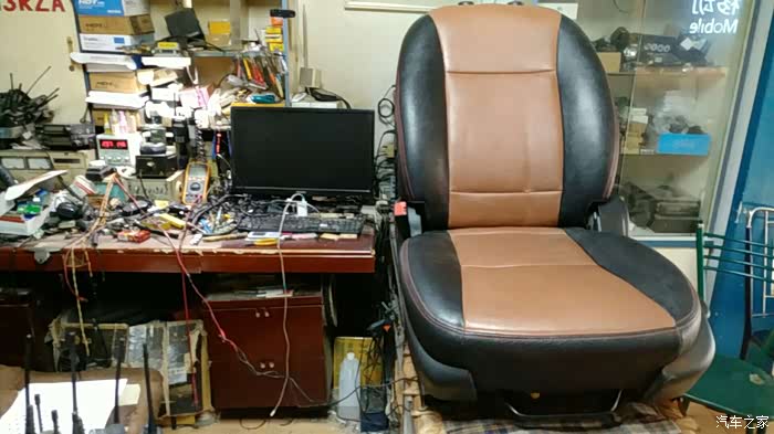 拆椅子把电热垫塞到座椅的蒙皮下面,一个人干活没顾上照相,抱歉各位。其实不复杂,就是麻烦。座椅的蒙皮缝线的地方和海绵的预埋铁丝是有铁环固定的,拆麻烦,装更麻烦。这是装好一个测试的照片。