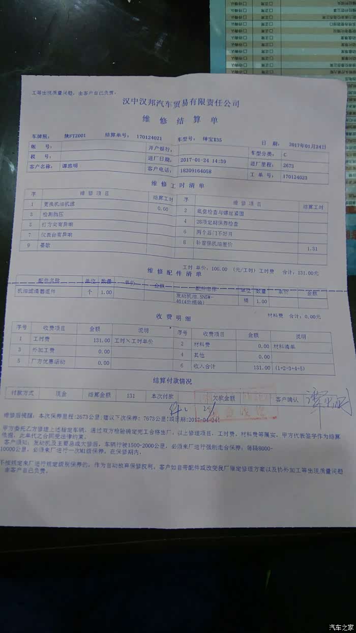 24号的上午接到4S店的电话告诉首保时间到了有空了去做首保,一看时间刚好三个月里程才2673公里。本来计划是年后去做首保的,但想到过年用车比较多就决定去保养,而且正好今天要回勉县反正要路过4S店。就给当时的销售打电话问了下情况下午就过去了。