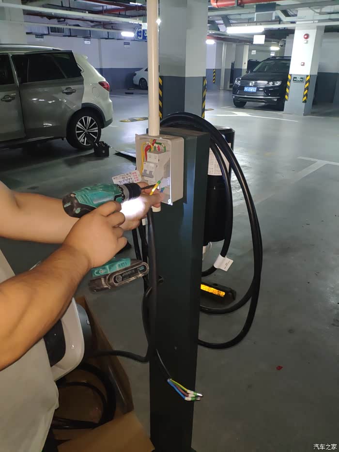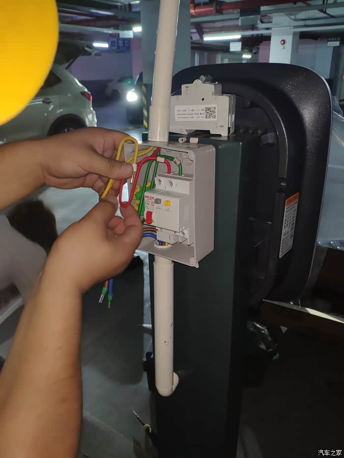 >然后安装的师傅将充电桩的电线从正面穿到了充电立柱的背面,并将电线引到空气开关盒中。>随后师傅完成了充电墙盒枪托的安装。师傅将电线与空气开关一一完成连接。