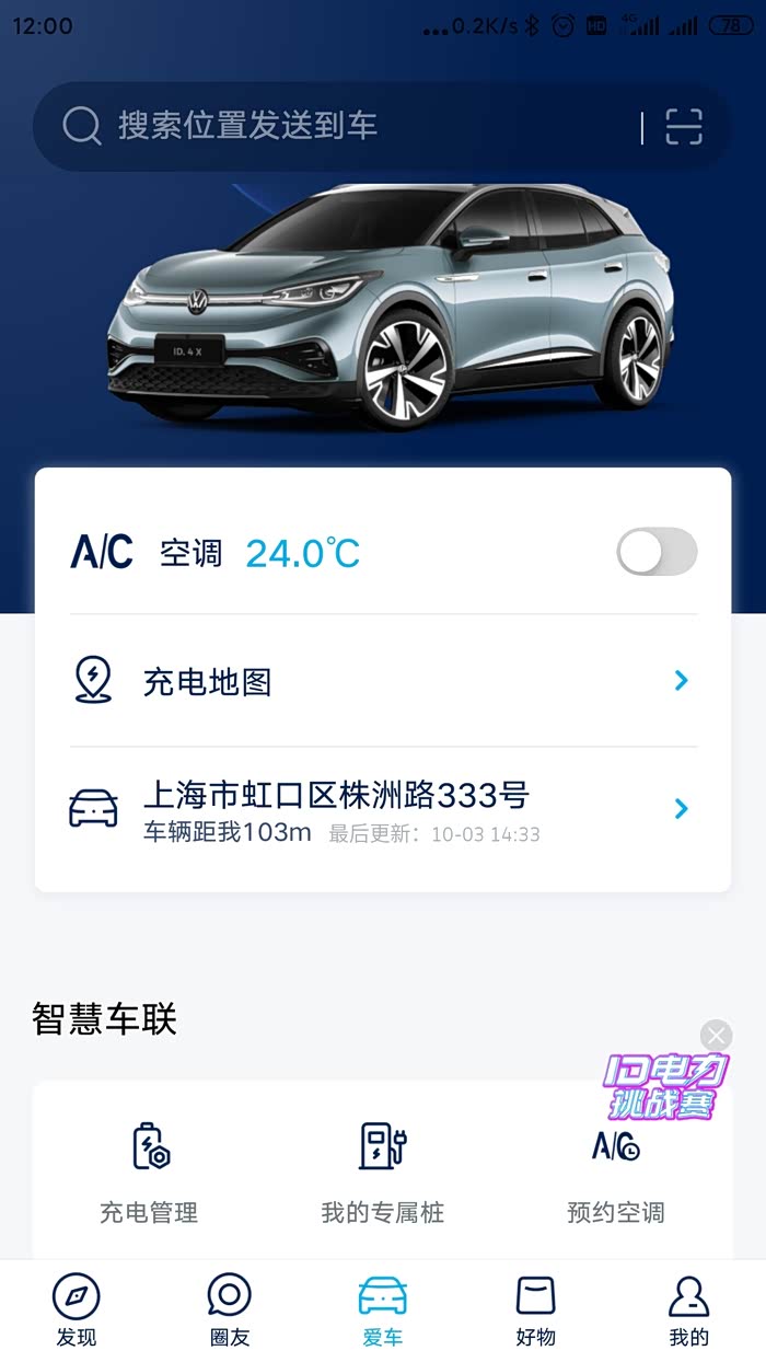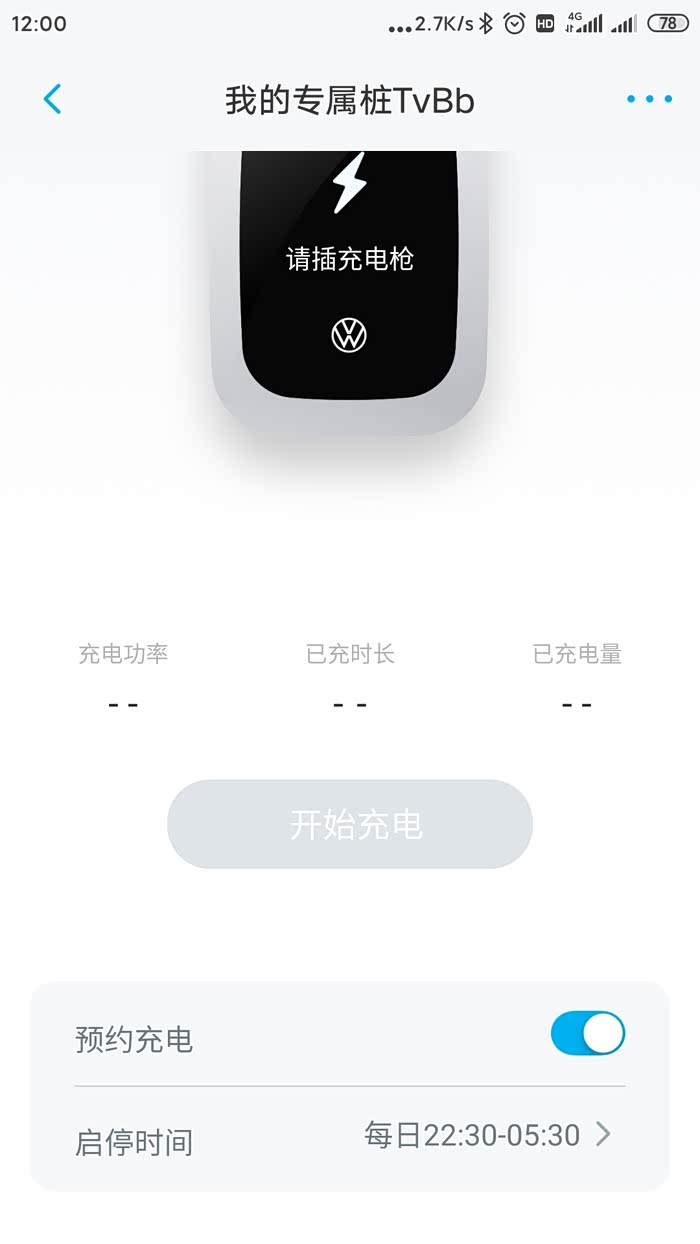 打开上汽大众超级app,选择爱车页面,点击我的专属桩,扫描充电桩枪托上的二维码,即可完成绑定,在我的专属桩界面里,可以实时查看充电功率、充电时长与已充电量。