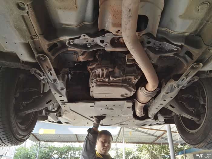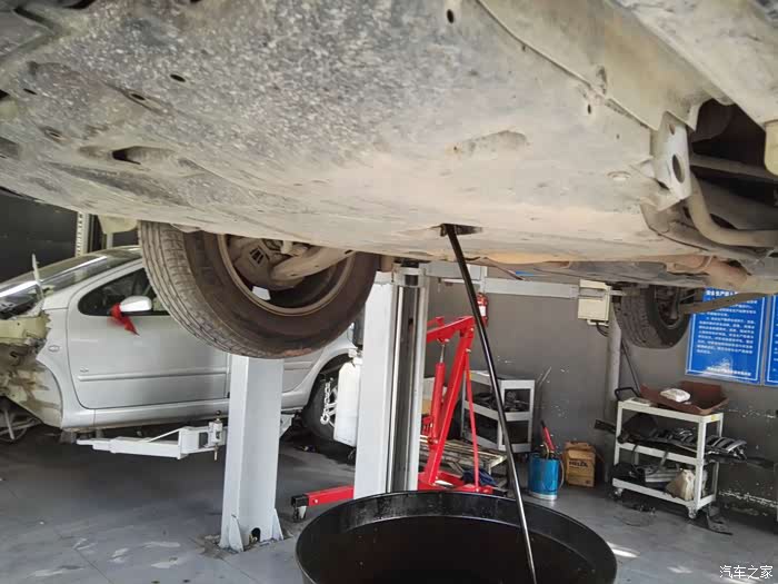 保养第六步,虎子下架,点火五分钟,然后熄火查油尺,液位在上孔附近,不多不少刚刚好!再上架举升,看看封堵螺栓是否紧固是否漏油,没问题,小保养完成。