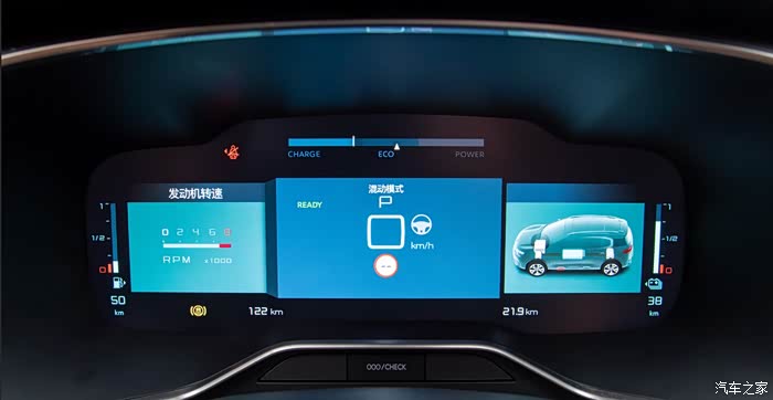 首先说说12.3英寸的全液晶仪表盘,显示的内容非常丰富,清晰度也非常高。有多种风格可选,并且支持页面的自定义。车辆行驶过程中,电量释放和动能回收都会实时的仪表上显示出来,让驾驶者对能量的消耗和存储情况一目了然。在速度显示方面还有一个小彩蛋,我们如果在混动模式下驾驶的话,需要看车机上混流的界面才知道动力输出到底是发动机在工作还是电机驱动。在了解这个彩蛋之后我就不再需要看车机了,液晶仪表上显示的车速会变颜色,蓝色代表电机驱动,白色代表发动机驱动,这一点真的很巧妙,给设计师加鸡腿。
