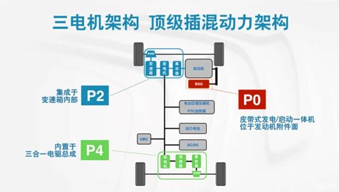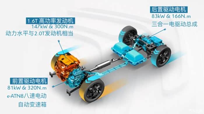 天逸PHEV是三擎四驱的动力布局,动力组成部分如下: