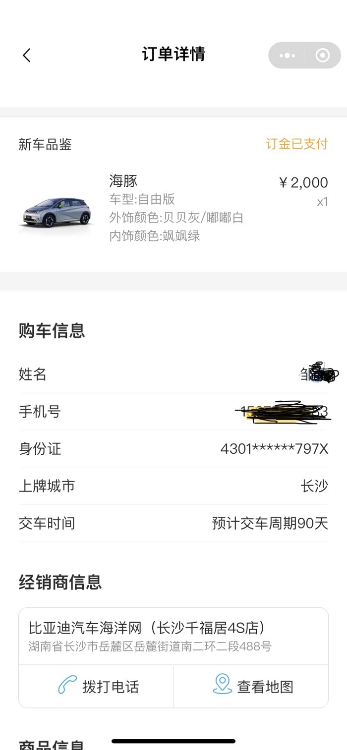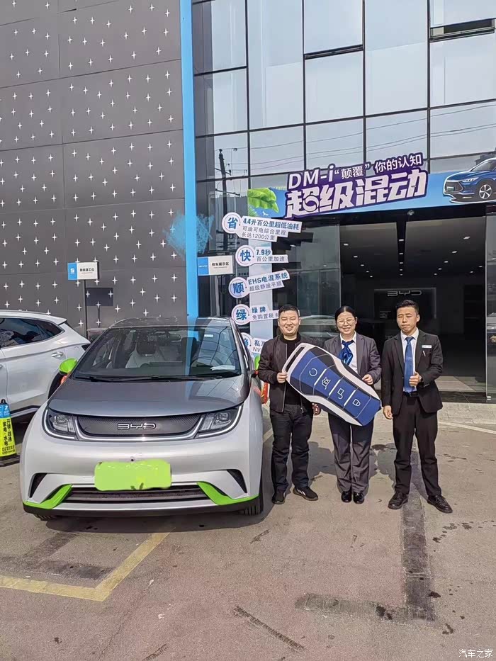 在二手车店告别了陪伴三年的老皇之后,立马打开之家搜了附近的海豚——长沙XX比亚迪4S店,有缘结识了芳姐。试驾时候,深刻感受到了这款电车和平时滴滴的不同,一脚电门下去没有电流声、没有外界噪音(当时是50以内),我知道,就是它了!试驾到订车,一共费时半个多小时,选定了10万38的自由版(老婆的车有全景天幕,感觉没有用。都买电车了,当然就一省到底,配置够用就行啦