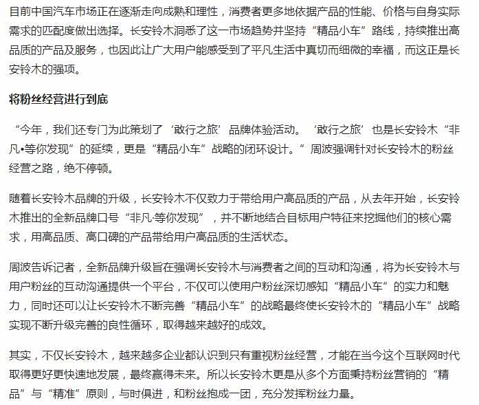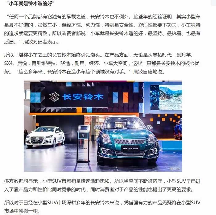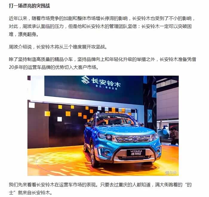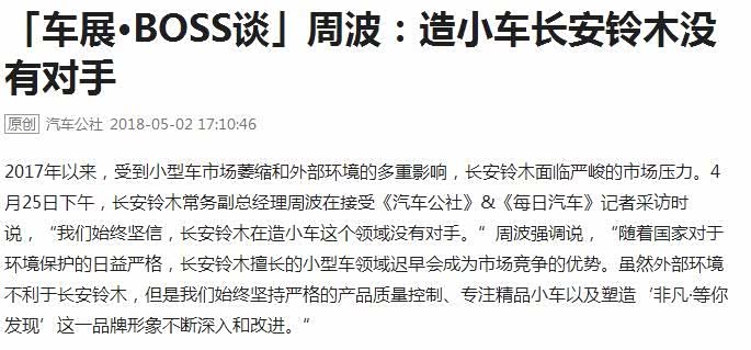 这段时间都在传言铃木退出中国市场,这是我们这些铃木车主最不愿看见的事情,各个论坛也是议论纷纷,很多心怀叵测的黑子无良乱语,就差用他祖宗十八代来发誓退市的就是铃木。昨晚刷头条看见一篇***,是长安铃木的boss出来说话了:「车展·BOSS谈」周波:造小车长安铃木没有对手!!
