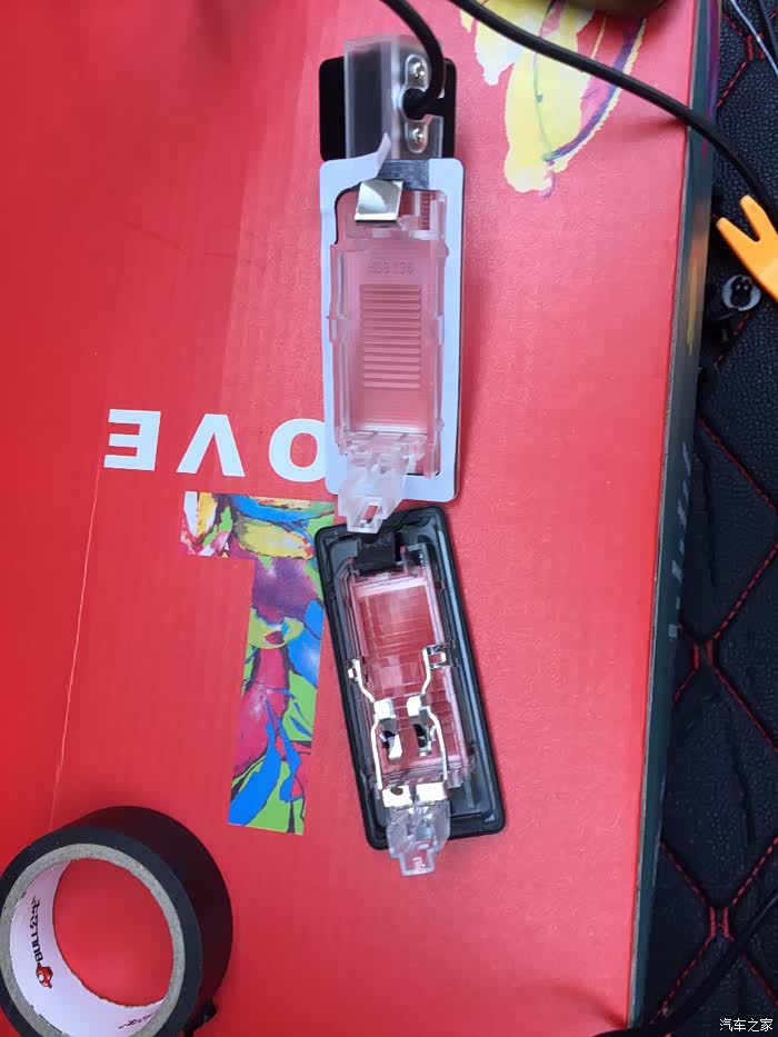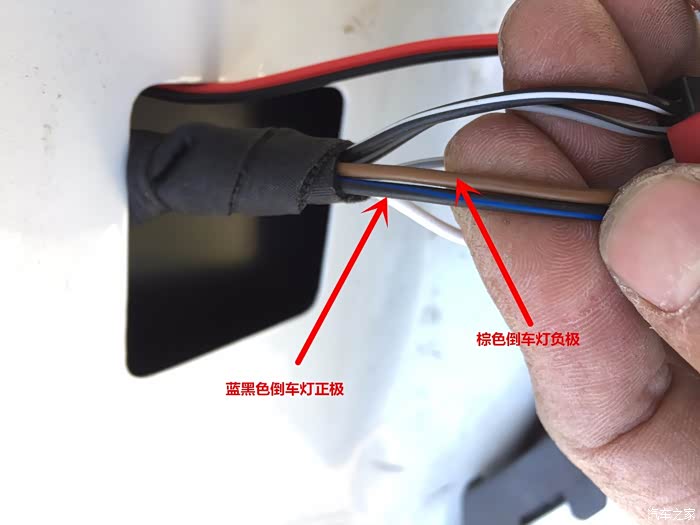 这两根就是倒车灯正极负极,跟摄像头的线并线。负极千万别随便搭铁,有时候倒车灯正极跟铁皮不能形成12V,接到纯负极线上增加稳定性。