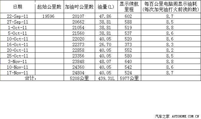 2.每百公里实际平均油耗:439.31*100/5208=8.44;每百公里电脑显示平均油耗:以上电脑读数相加/11=8.57,这两个数的对比相差不大,不是传说中实际油耗比电脑显示油耗少1个油的说法;
