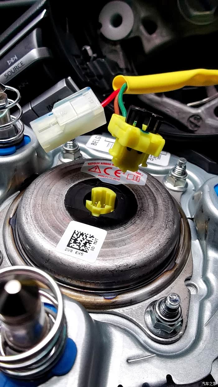 中间黑色卡扣抠起即可拔出气囊插头,旁边白色的是喇叭插头