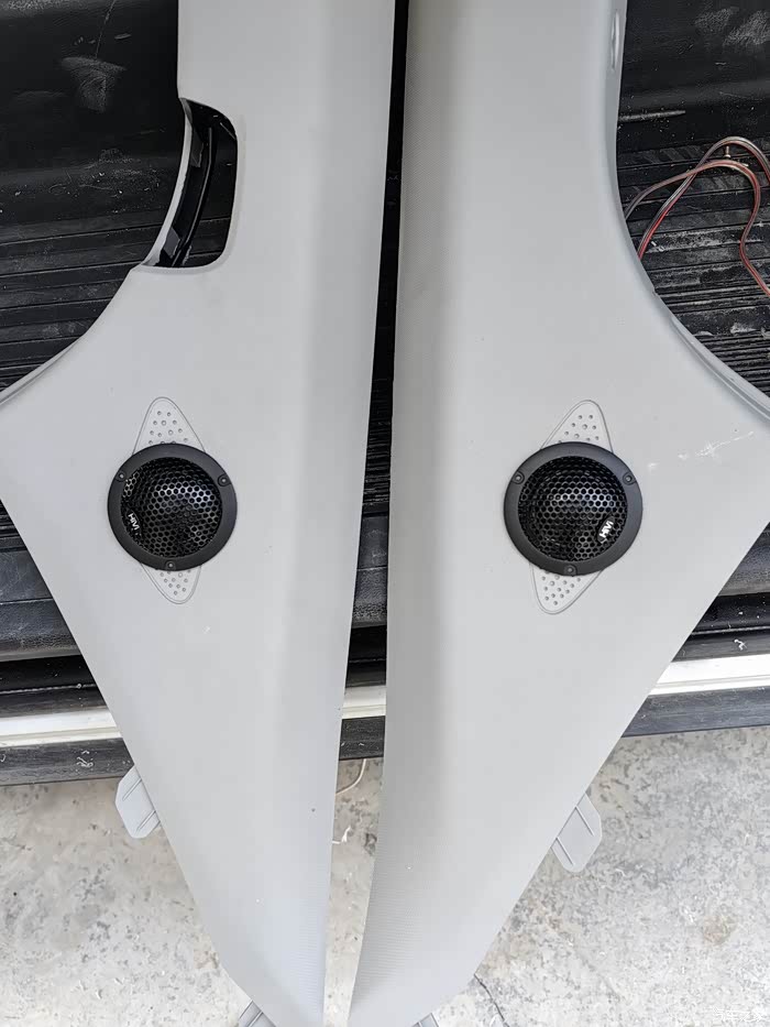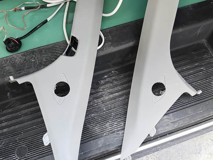 趁热打铁接着装高音喇叭,当然,高音不是随便乱装的,为了相位和指向性最佳,我选择开孔安装!其实不开孔,内部空间也是足够的,但将高音放在A柱饰板内高音的指向性会受到较大影响,听歌的时候会使声场混乱,定位失准。毕竟只有两声道系统,声场定位是非常重要的。