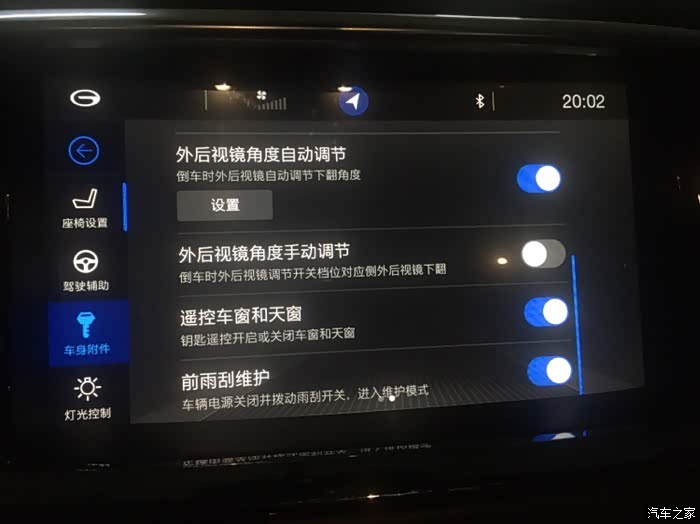 2、中控,选择车辆设置,车身附件,在车身附件菜单下左滑动,开启前雨刮维护