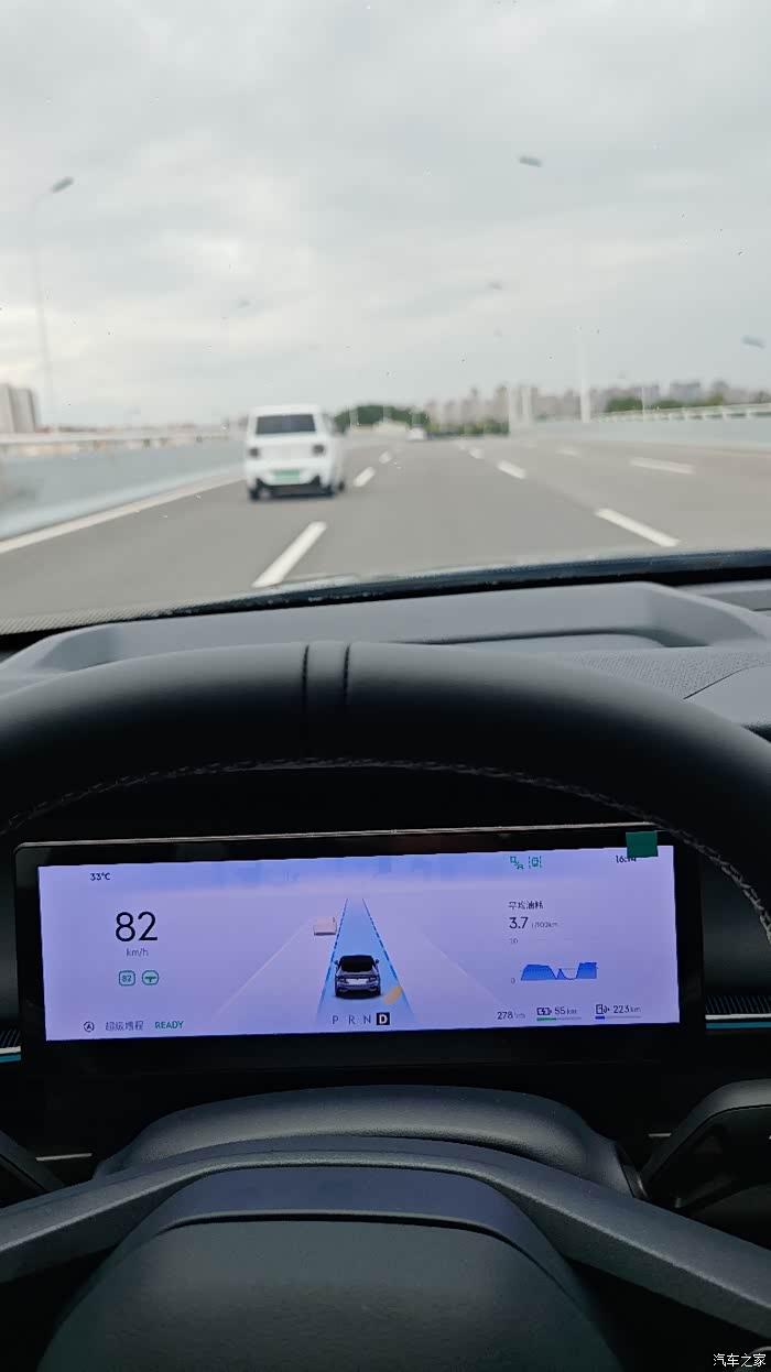 除此之外,还要表扬的一点就是辅助驾驶功能,跑高速或快速路的时候开启自适应巡航,把驾驶操作交给车机,自己只要扶着方向盘即可,极大程度的增加了驾驶舒适性,顺便一提,自适应巡航比我自己开能耗低…貌似它脚法比我好不少…
