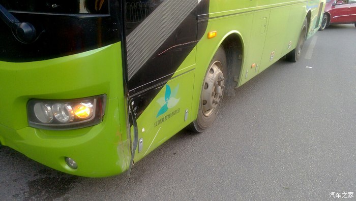 我在等红绿灯。这辆公交车忘拉手刹,倒车把我撞了。