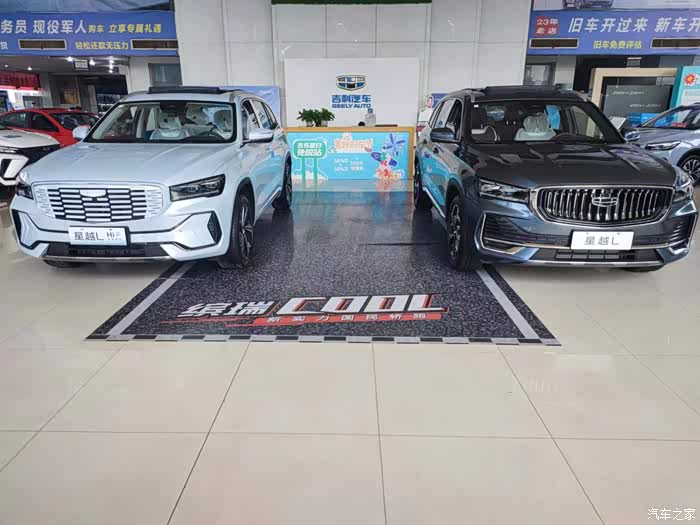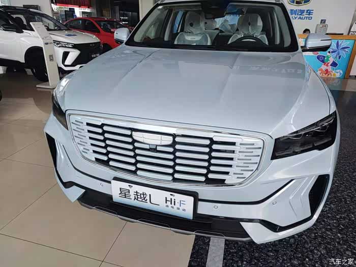 店里面今天看到两台星越L,右边的是燃油版的 左边的是混动版的,从正面房堪,抛开颜色的因素,混动的中网这部分非常有特色,据说启动的时候会发光,在晚上肯定非常的醒目。