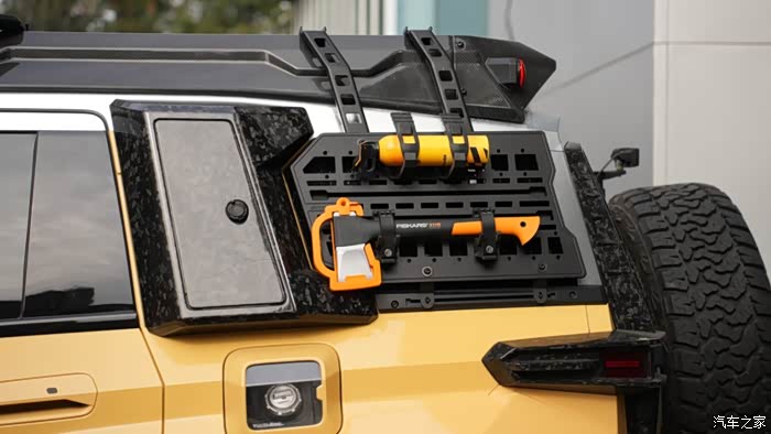 侧身设计也是硬汉风格,锋利的线条、还有封闭式轮圈、295的AT固特异轮胎、C窗挂板上还能放油桶支架、工兵铲、消防斧和灭火器等等。