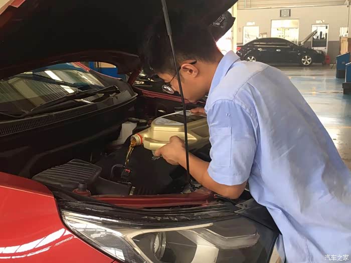 小伙子还是很熟练的,一滴油也没有浪费!新机油是淡黄色的!