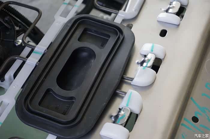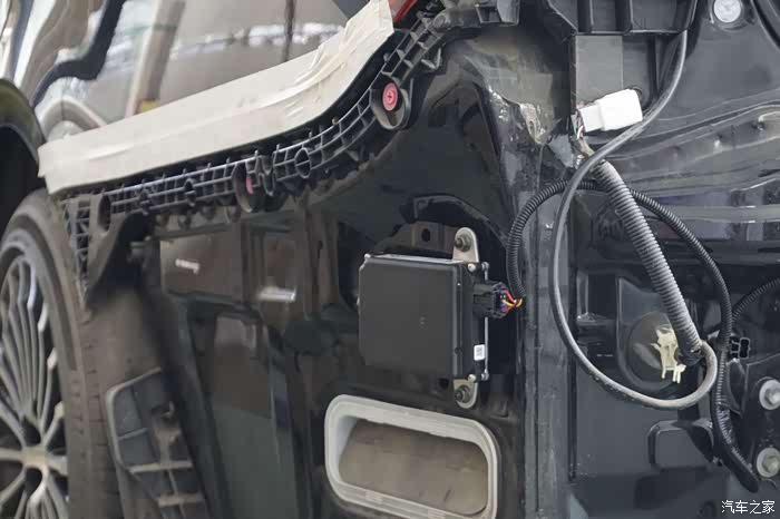 师傅们拆开后杠并且安装上BSM并线辅助的探头,左侧叶子板位置
