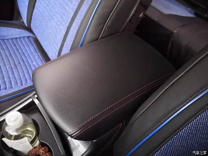 中央扶手软皮包裹,红色线条缝制,手感很好