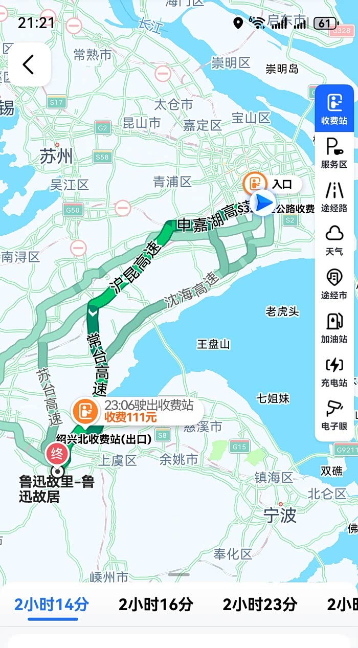 极狐T1的续航力真的不得不说一下。出行前特地查阅了指南,沪昆高速诸暨服务区(昆明方向)设有2个快速充电站,绍兴鲁迅中路77号亦有充电设施,因此制定了行程:从上海出发前将电池充满(续航约400公里),导航显示单程180公里,前往绍兴往返加上市内游玩,大约400公里。我起初略微担忧续航问题,但驾驶后发现,极狐T1的续航确实可靠!