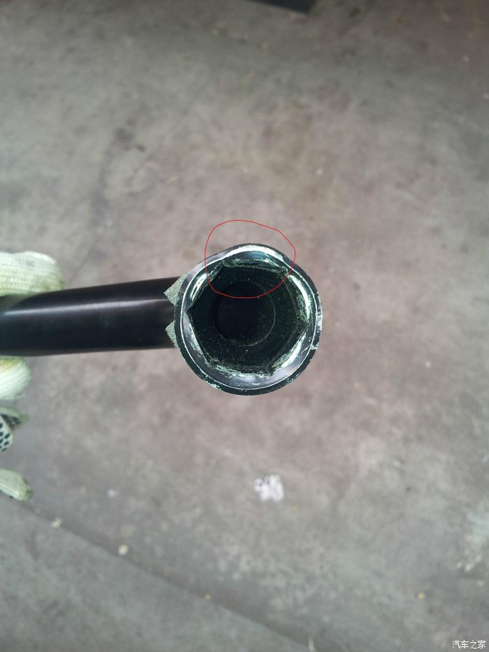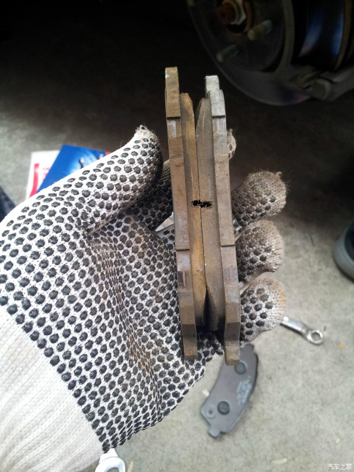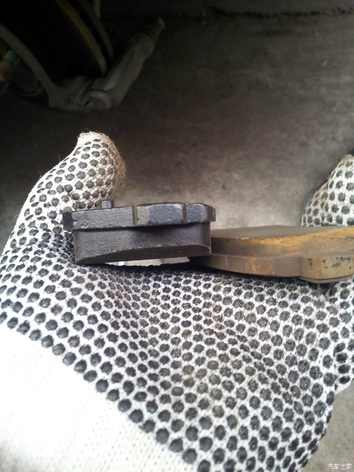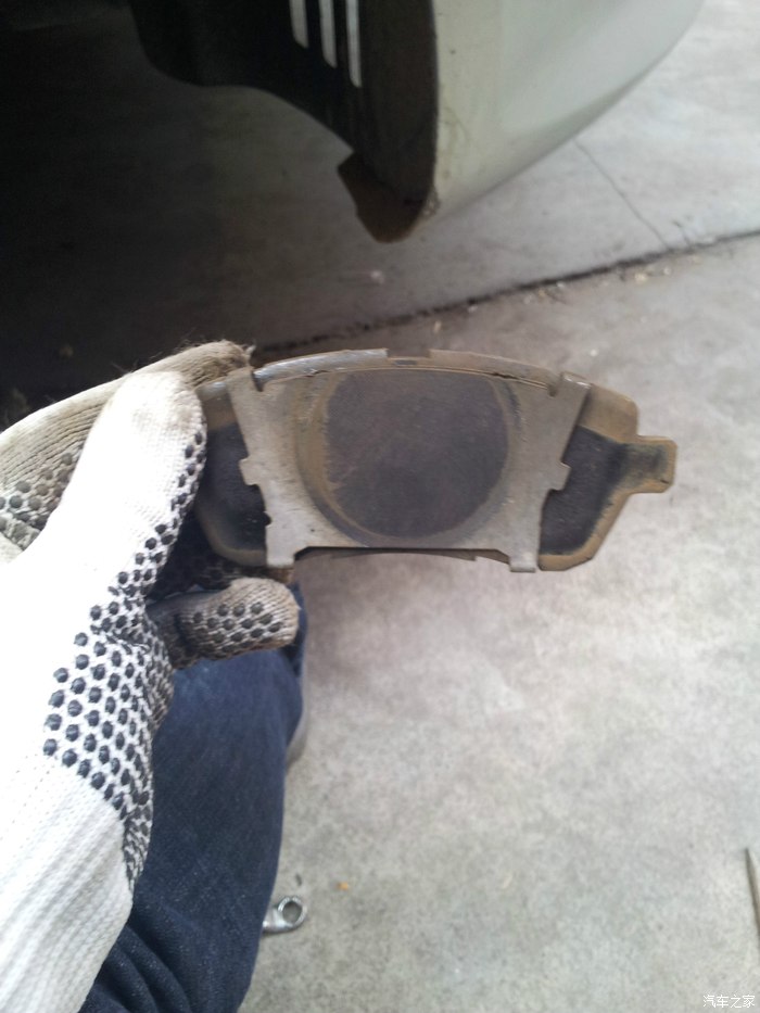 拆出螺丝后就向上转动刹车分泵,就可以拆出刹车皮,刹车 皮拆出后发现原来刹车皮还有差不多一半这么多可以再跑个2W公里不成问题,所以不用换。