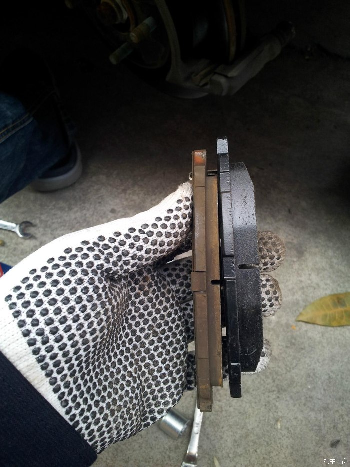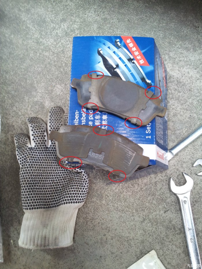 车是去年11月从朋友手中买的二手车走了5W公里了,由上星期开始听到刹车有吱吱响,估计是刹车皮快没了磨到报警销了,就去网上买了一对博世的刹车皮,今天星期6放假有空就自己动手换。其实换一边刹车皮只松6个螺丝就可以了,轮胎4个,刹车2个。准备19开口扳手,14梅花扳手,12梅花扳手。