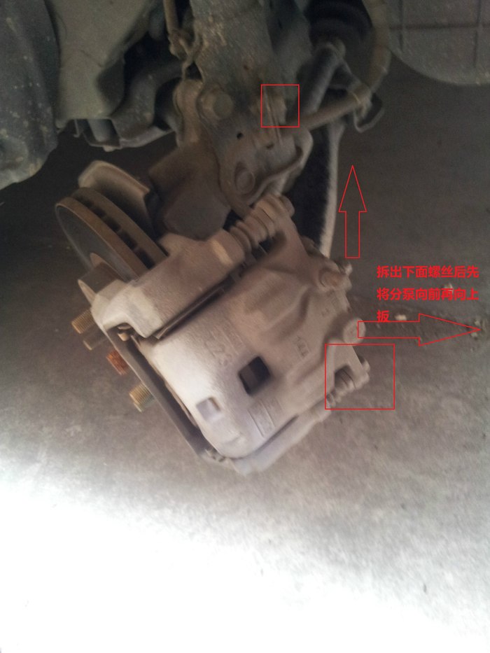 拆轮胎后就看到刹车分泵,上面用红色的地方就是我们要松螺丝的两个地方。上面用12梅花扳手,下面用14梅花扳手和19开口扳手,反时钟方向松开。