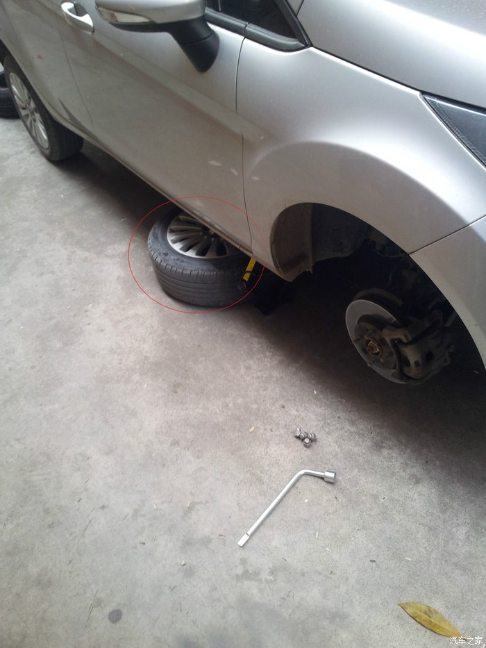 这里首先要批评一下福特的轮胎扳手太差了只松了一个轮胎螺母就变型了还家里另一辆车上有轮胎扳手,所以建议同学买一个质量好的放车上万一那天在一个前不着村后不着店的地方要换胎就麻烦了!