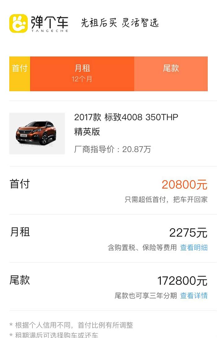 标志4008,首付只需2.08万就可以开走,一年后可退可买可分期