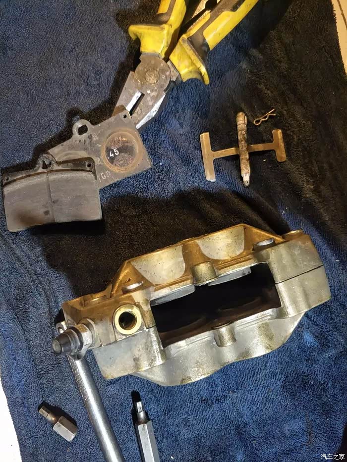 脱开油管连接卡钳空心螺丝(注意垫片),这个布雷博换刹车片不需要拆下卡钳直接在背面就能更换。