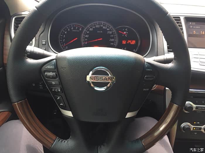 桃木多功能方向盘,左边是切换收音机、CD、调节声音大小、蓝牙电话等功能,右边是定速巡航按键。