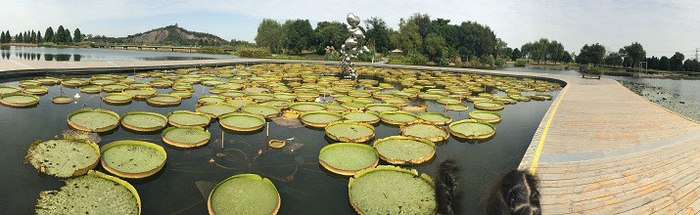 曲径通幽处,过了小桥来到了,一片荷花池,定睛一看不是普通的荷花,原来是魔王莲,就是电视上介绍的,每片叶子可以承受一个小孩,可惜,盛夏已过,秋天使其叶子破败不堪,无法见证奇迹的发生。叶子看不到,但是花还是很美的,按下几下快门,恋恋不舍的离开了。