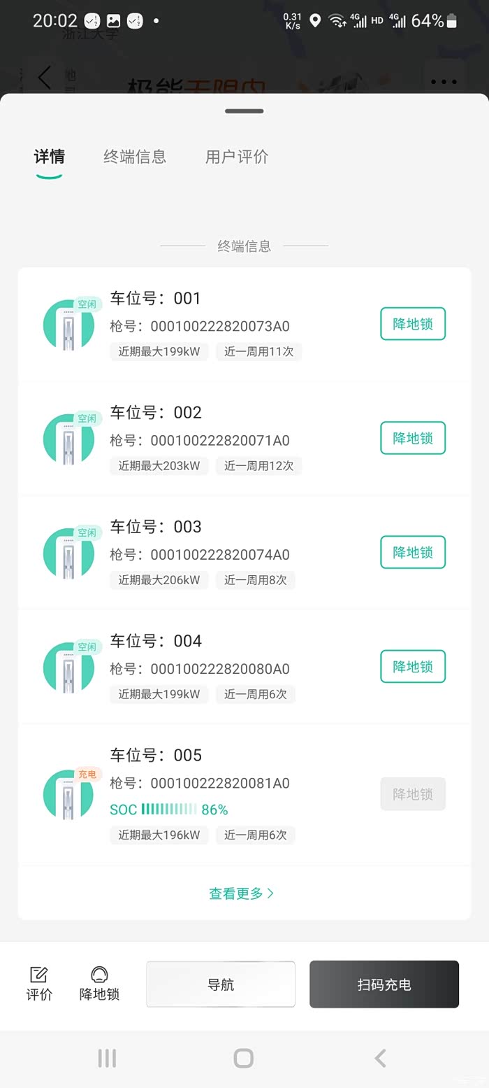 选择好充电站后,开到指定区域,选择想要的充电桩,点击降地锁。注意,地锁下降后,需要在指定时间(一般两三分钟)驶入停车位。停稳车辆后进入下一步。