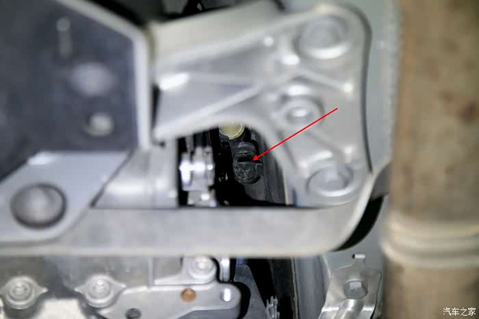 这是我 E92 的排水口位置——由后向前看,在变速器支撑座靠前一点。