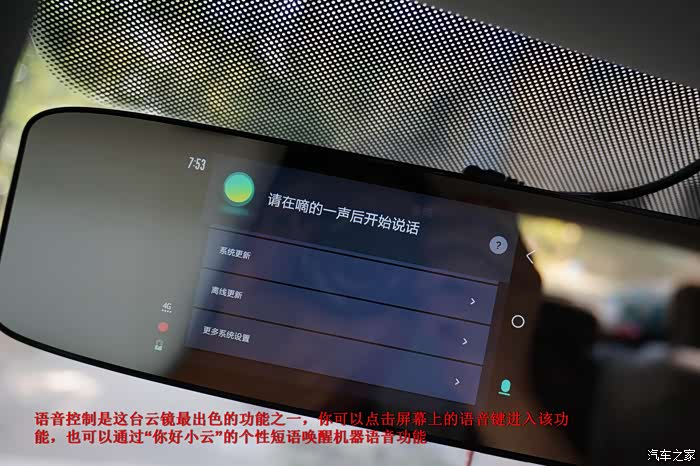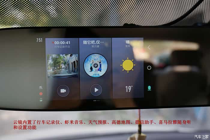 机器内置行车记录仪、虾米音乐、天气预报、高德地图、微信助手、喜马拉雅随身听等功能,支持蓝牙电话、云狗、WIFI热点等功能,特色功能在于语音控制,你可以点击麦克风按键,也可以使用个性短语唤醒机器。通过语音控制,你可以完成让记录仪拍照录像、APP的打开关闭,对记录仪的设置等许多功能,充分解放双手,让你可以专心开车。而在手机上下载好APP后,与车子的云镜绑定后,你可以完成驾驶数据、行驶轨迹、拍摄视频、震动告警等功能,从而查看行驶里程、时间、平均车速、急操作的次数,对行驶习惯进行评分,而拍摄视频功能可以远程让记录仪启动视频录制,并回传到你的手机上,震动告警是在停车后受到震动拍摄视频,并回传到你的手机上。