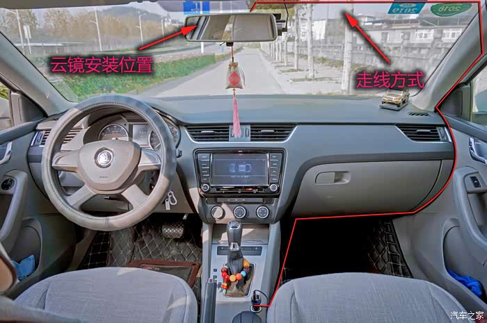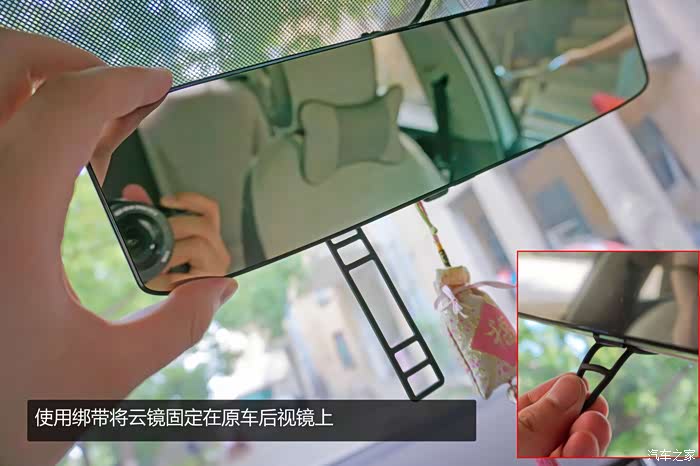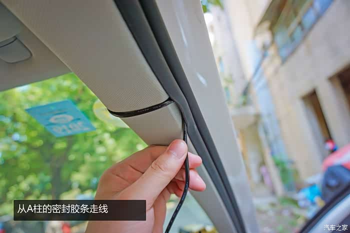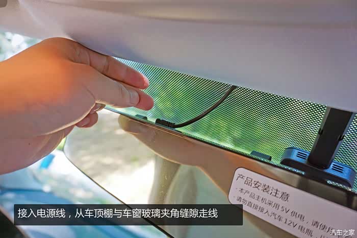 机器安装非常方便,由车充供电,从A柱密封胶条、顶棚与前挡风玻璃交角处走线,这样线束可以隐藏起来安装后更加美观。记录仪的主体需要用绑带绑在中央后视镜上,注意安装时要把摄像头露出来。