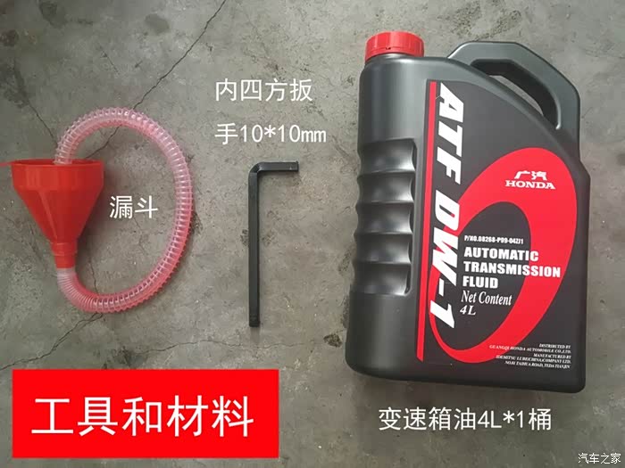 换变速箱油开始了,从自己动手角度材料和工具最重要:1.漏斗长颈的(变速箱油尺口里车头上面有一段距离,徒手肯定洒一舱,除非卖油翁)几块钱一个网购,2.内四方10*10mm扳手,也是几块钱一个网购,拆放油螺丝用。3,材料自动变速箱油4升装的一桶,本田平行轴变速箱自行研发,用原厂油,东广本参数差不多一样,纠结的自己买白桶,JD买160多元。
